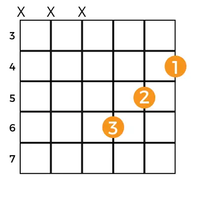 Shape 3 is a simplified version of the A minor bar chord shape that is useful for beginners. For this shape, place your first finger on high E-string fret four. Follow that with your second finger on B-string fret 5, and finally, place your third finger G-string fret six.